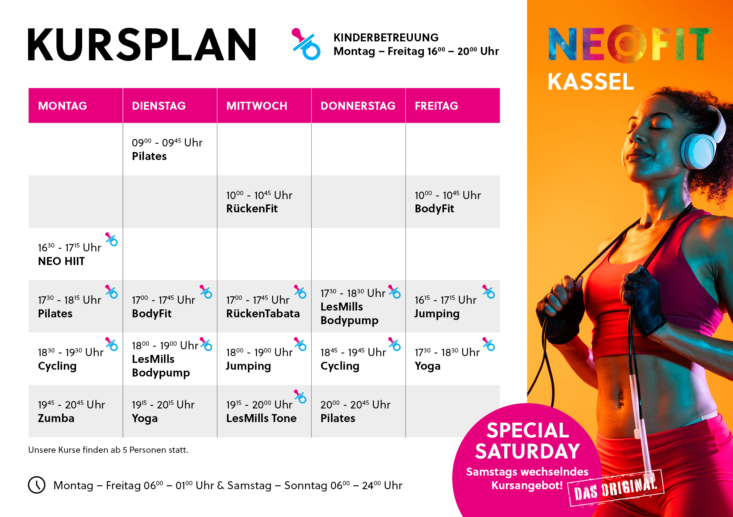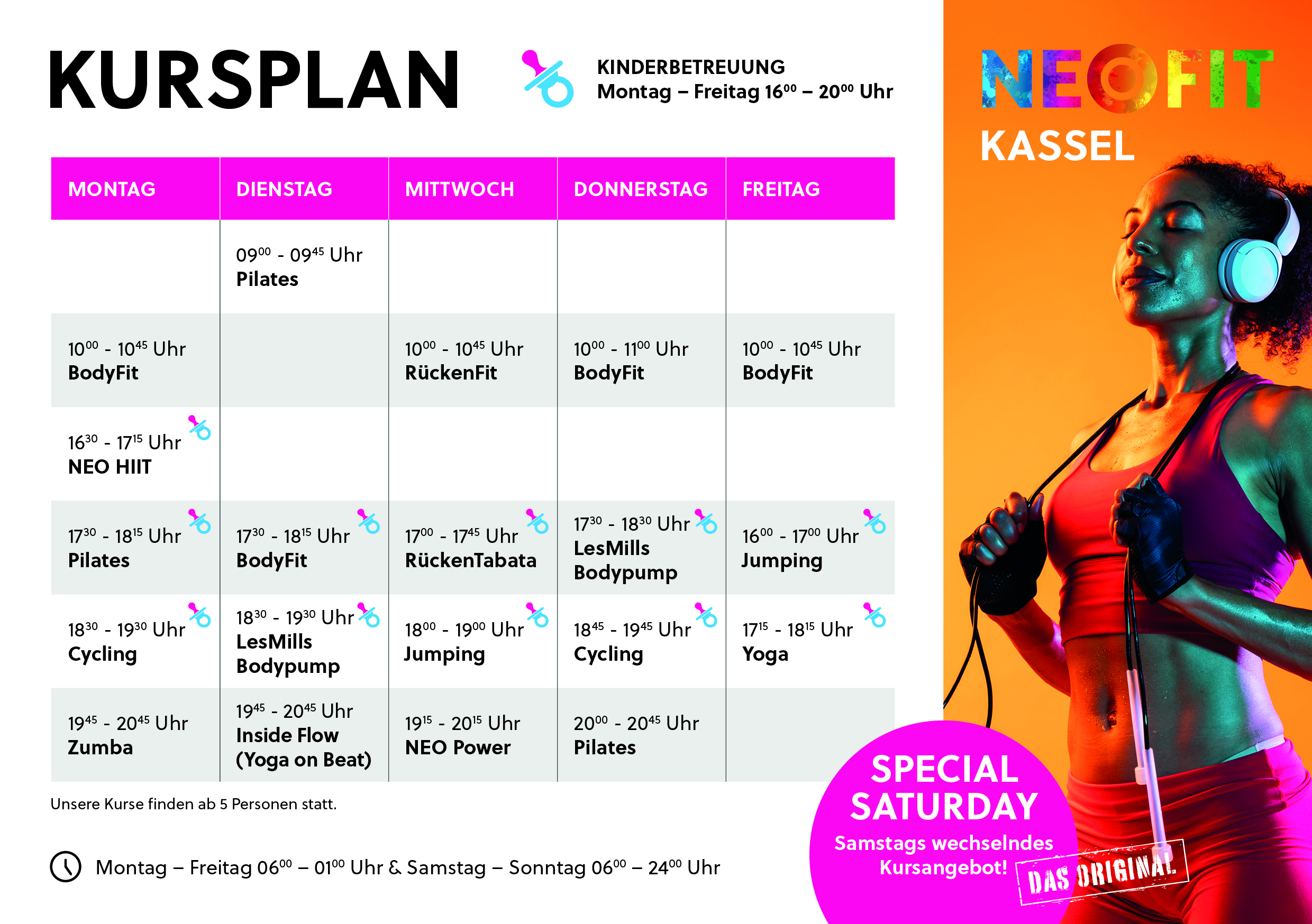 Ob Power oder Entspannung – in unserem Kursplan findest du genau das, worauf du Lust hast. Und das Beste: Während du trainierst, kümmern wir uns um die Kids – montags bis freitags von 16:00 bis 20:00 Uhr. So kannst du dein Workout ganz entspannt genießen.
